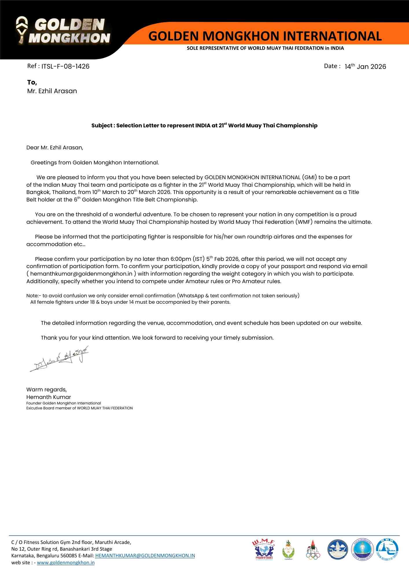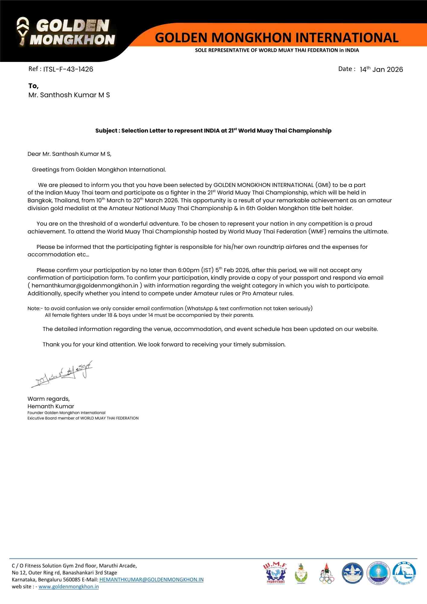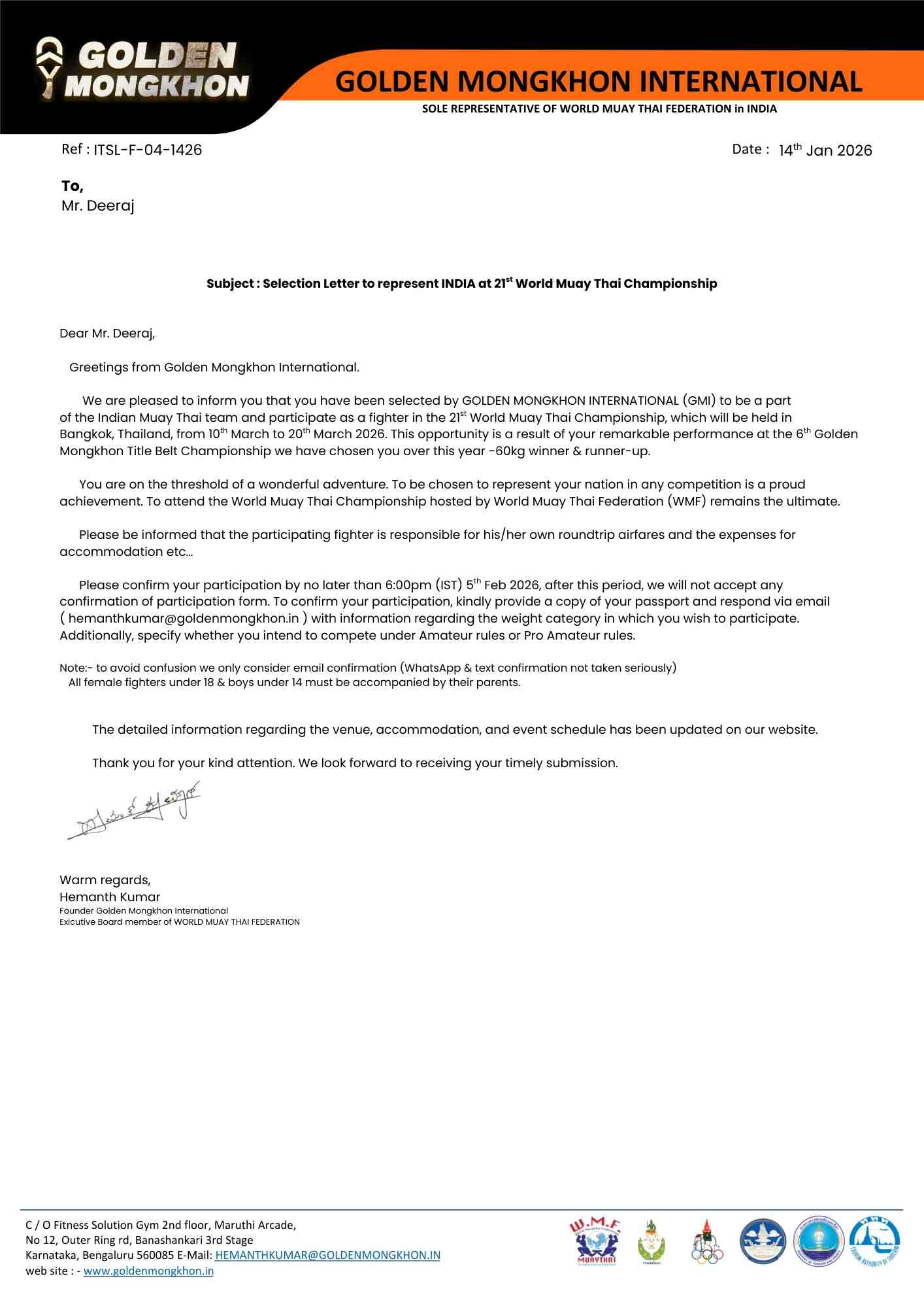 Representing India on the world stage is a major honour. Therefore, Golden Mongkhon International encourages all selected fighters to train with focus, discipline, and respect for Muay Thai.