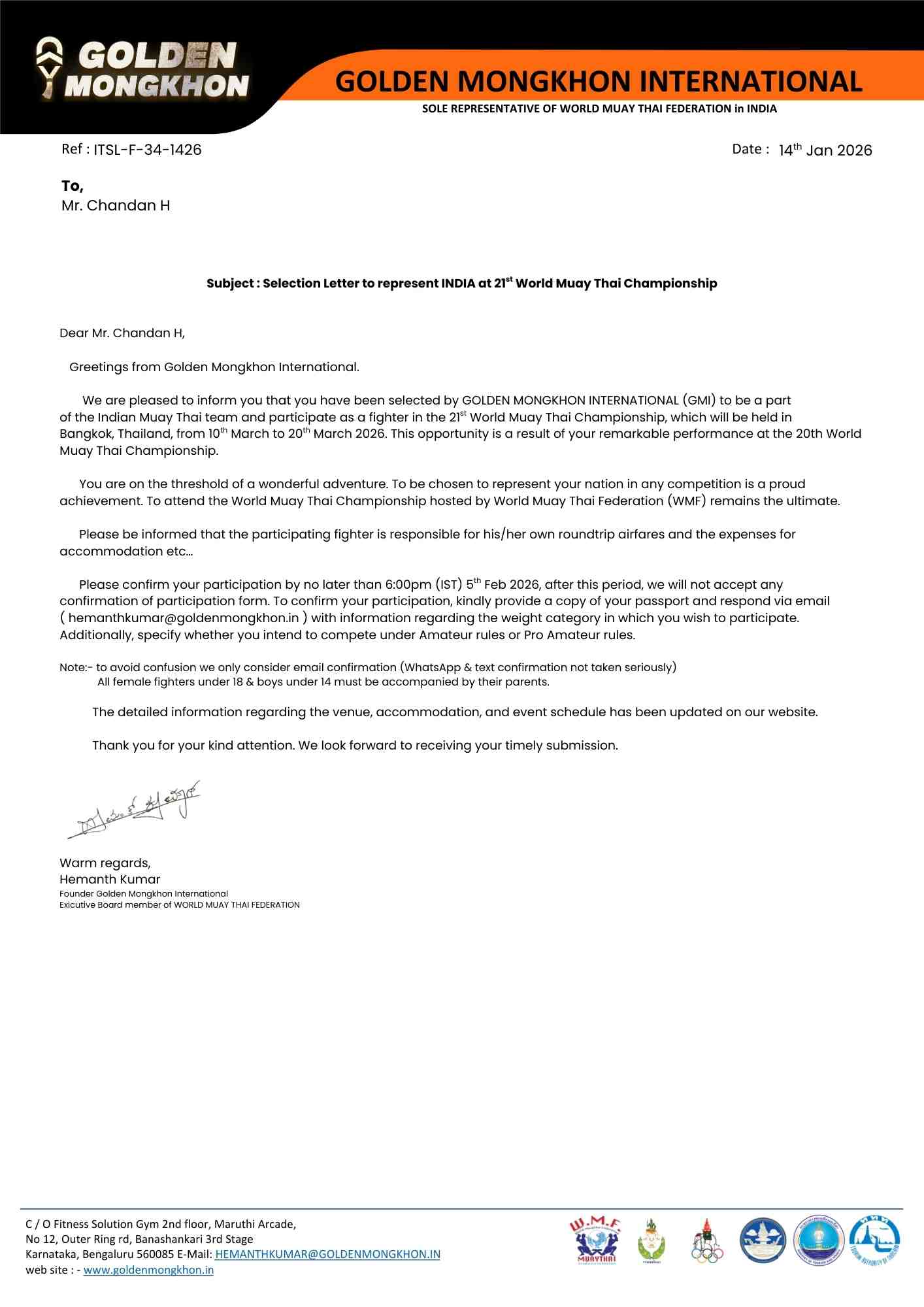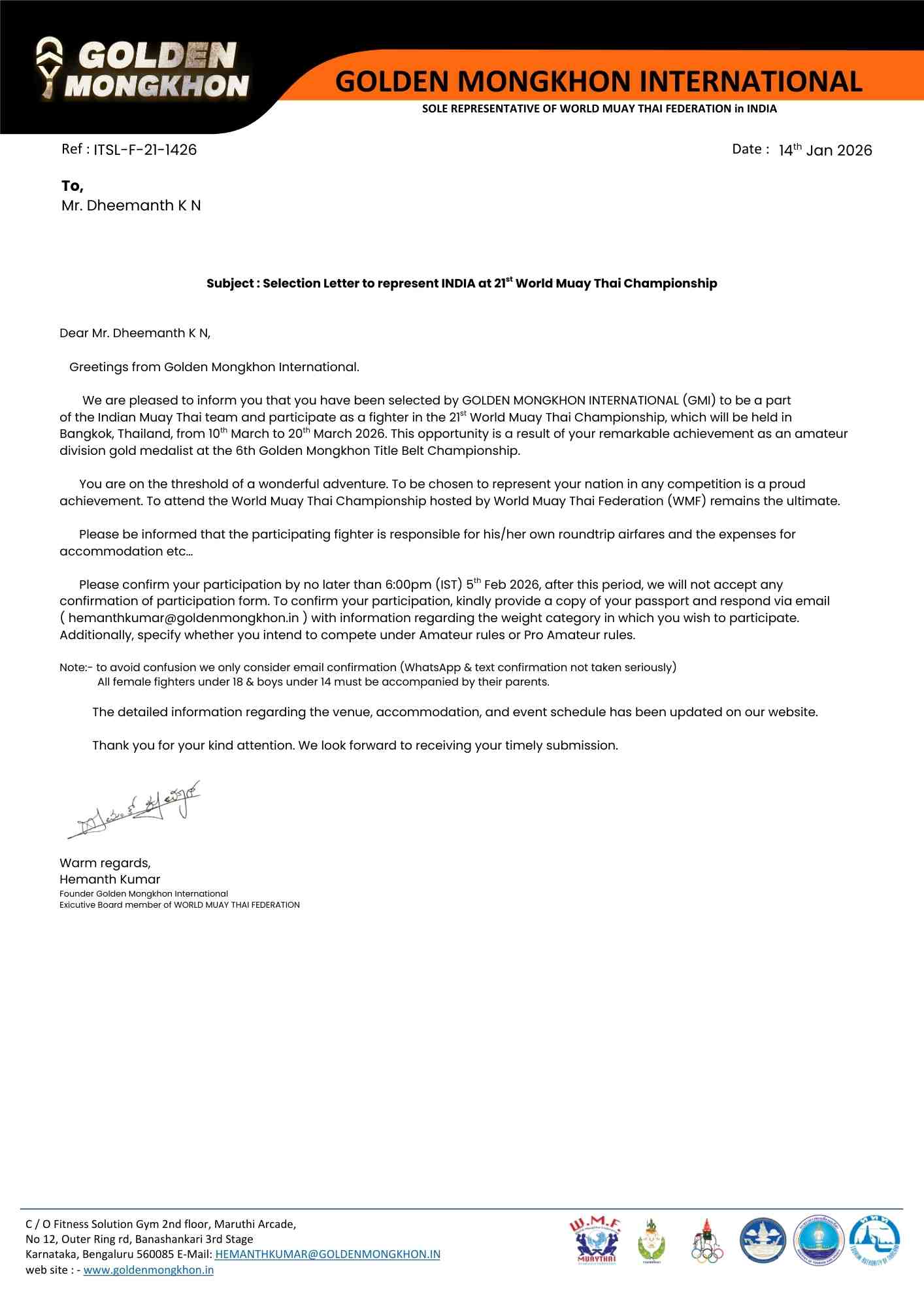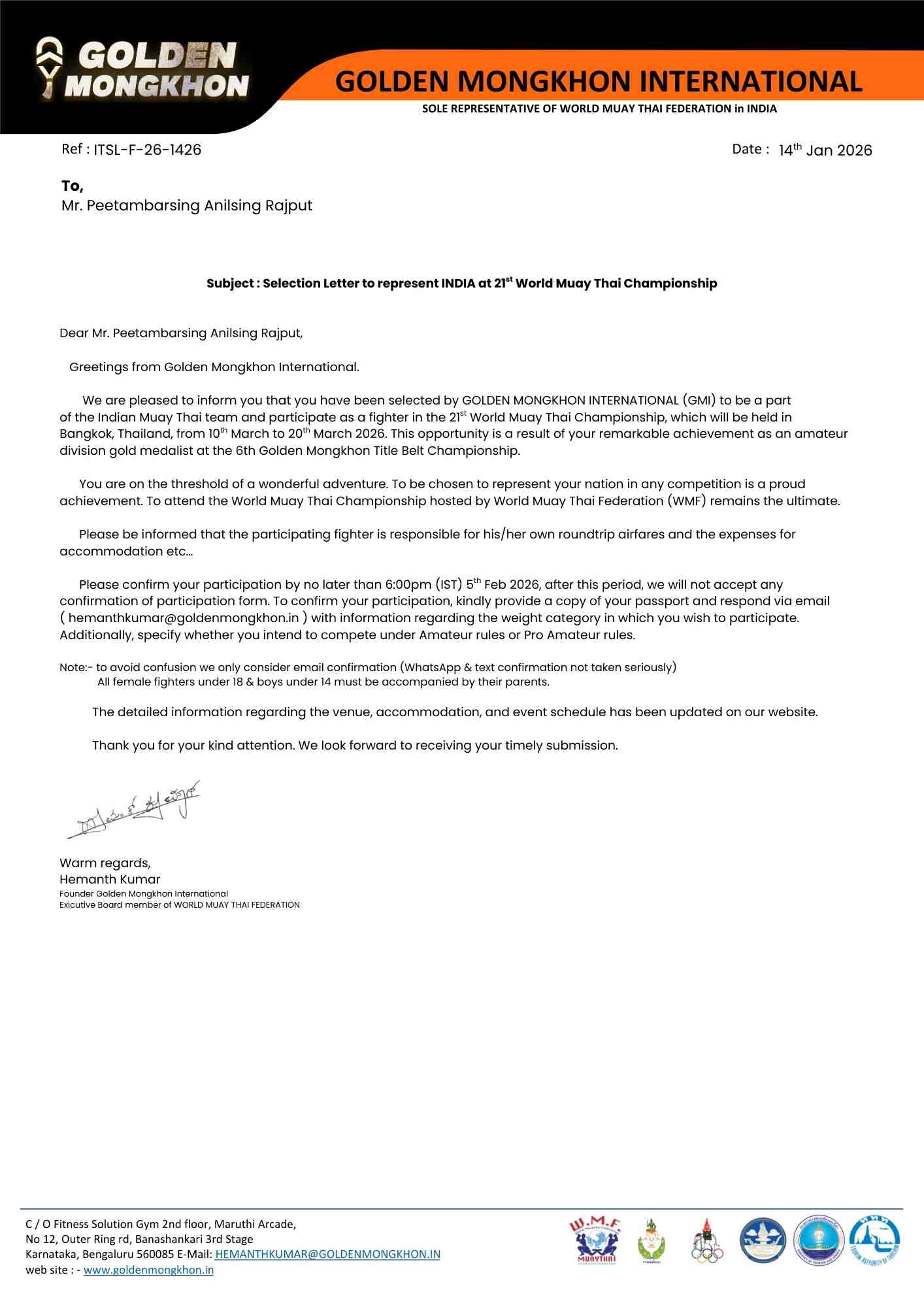 Representing India on the world stage is a major honour. Therefore, Golden Mongkhon International encourages all selected fighters to train with focus, discipline, and respect for Muay Thai.