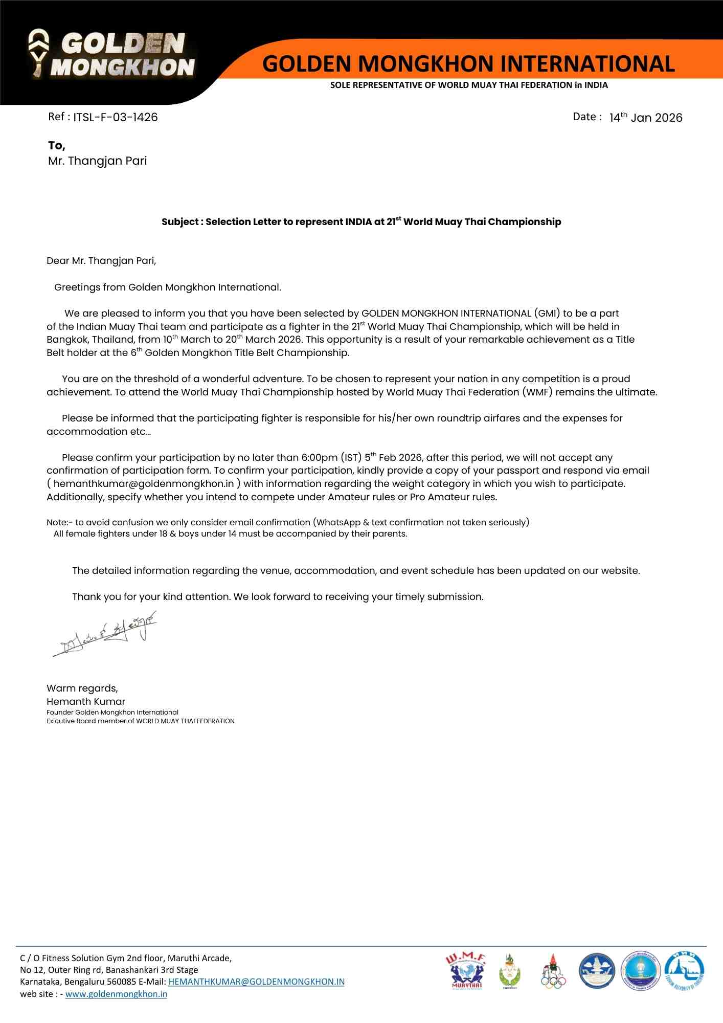 Golden Mongkhon International proudly announces the fighters selected to represent Team India at the 21st WMF World Muay Thai Championship, which will take place from 10th to 20th March 2026 in Bangkok, Thailand.
